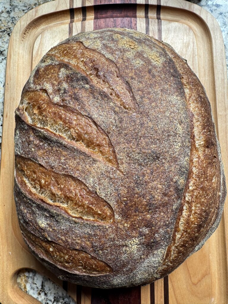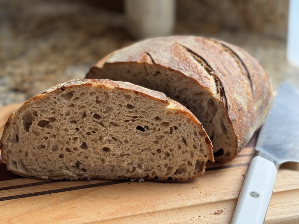 This is probably the lower end of whole wheat percentage that I would use if going for a loaf that feels like a whole wheat loaf. Next time, I think I will try 60/20/20. I think the crumb could be darker and flavor be a tad more wheaty.