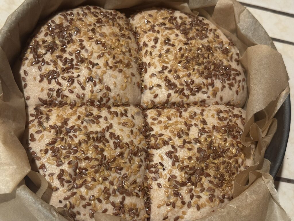 Since I planned to take the bread climbing, I wanted something easier to cut than a boule. Likely influenced by monkey bread on the Great British Baking Show, I decided to experiment with forming the other half of the dough into four bun shapes and proofing them together. I proofed them in a springform pan lined with parchment paper.