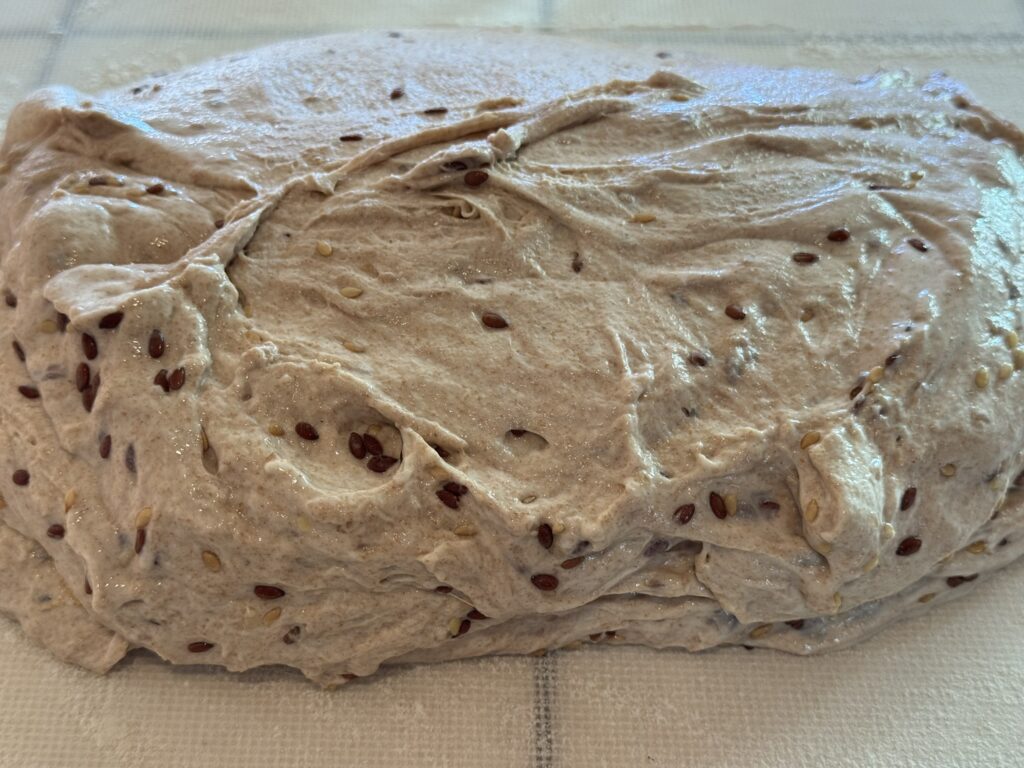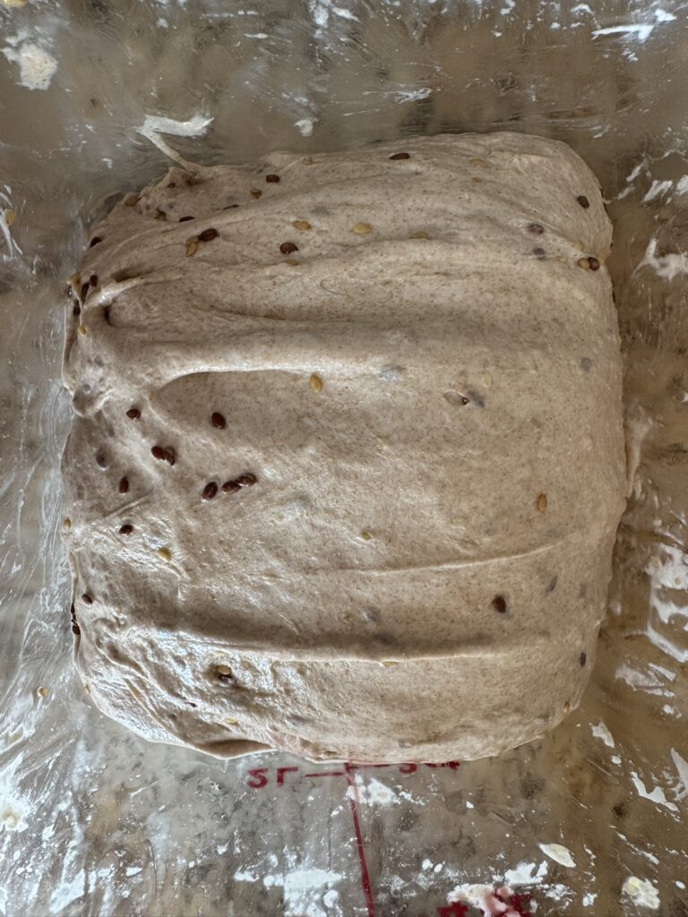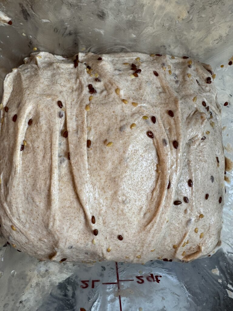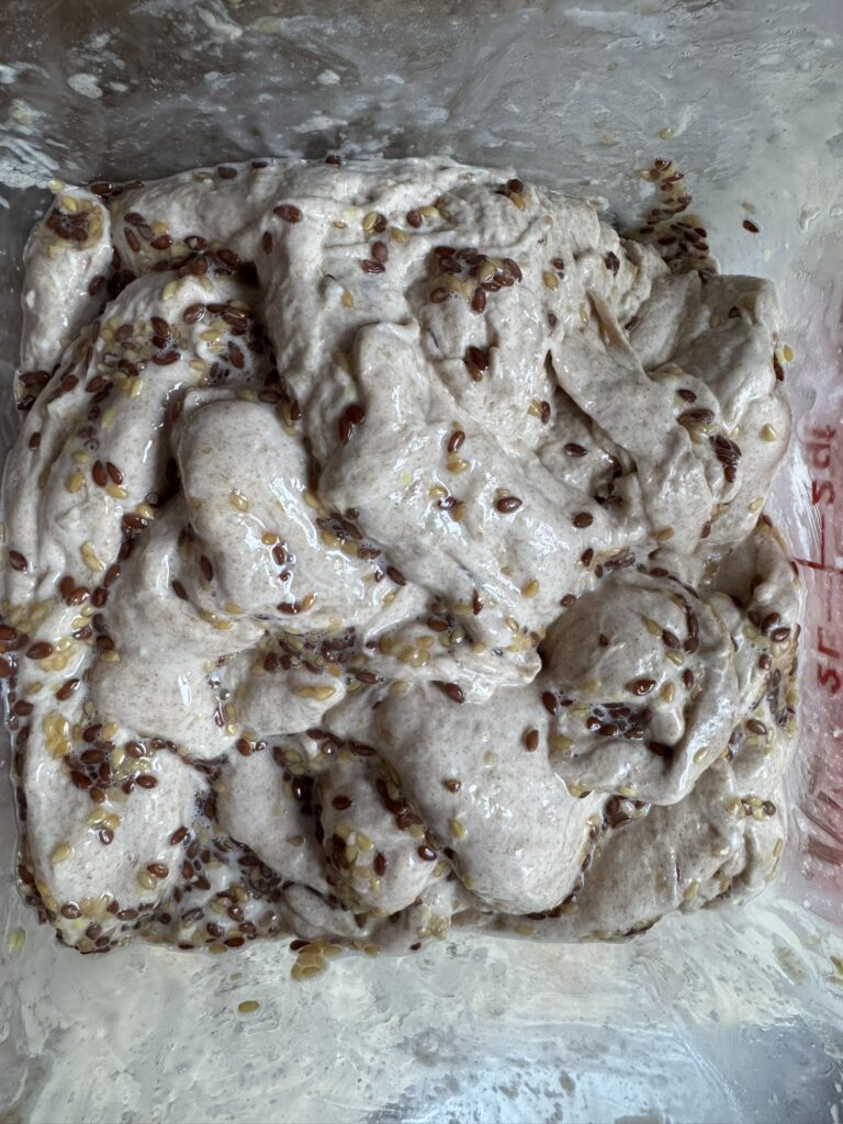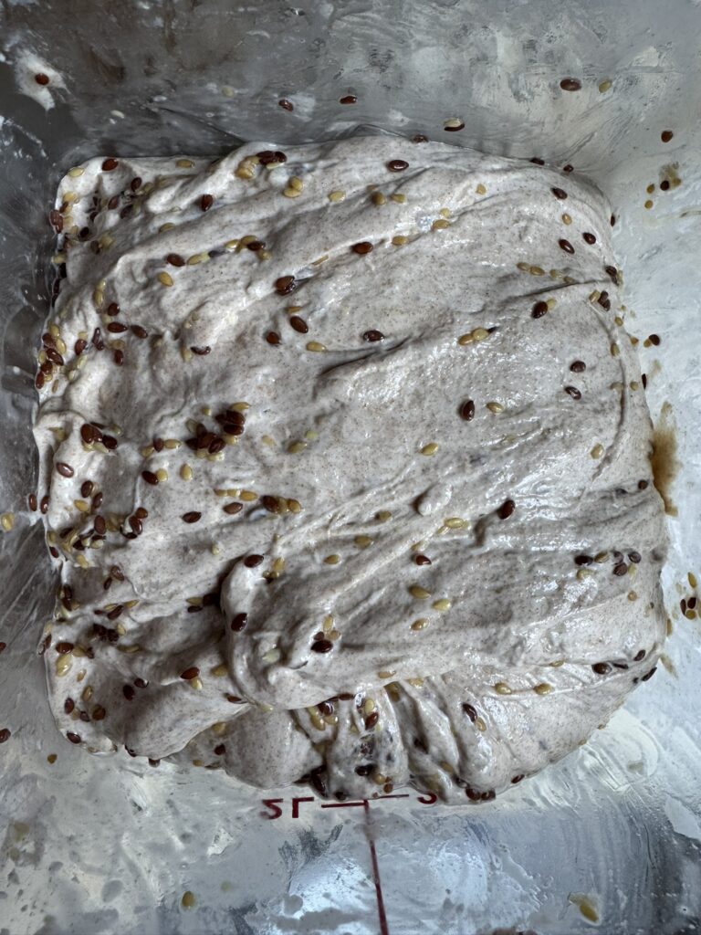 Meanwhile, I proceeded with the dough. I did the normal autolyse with the flour, water, and levain. I was feeling lazy about separating the flax seeds from the soaking water, so I just added the salt to the flax seed soak, and then I added the entire bowl of flax+water+salt to the dough after the autolyse.