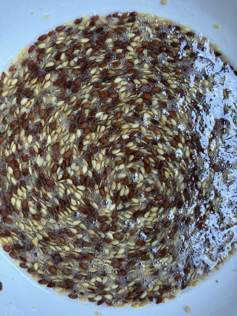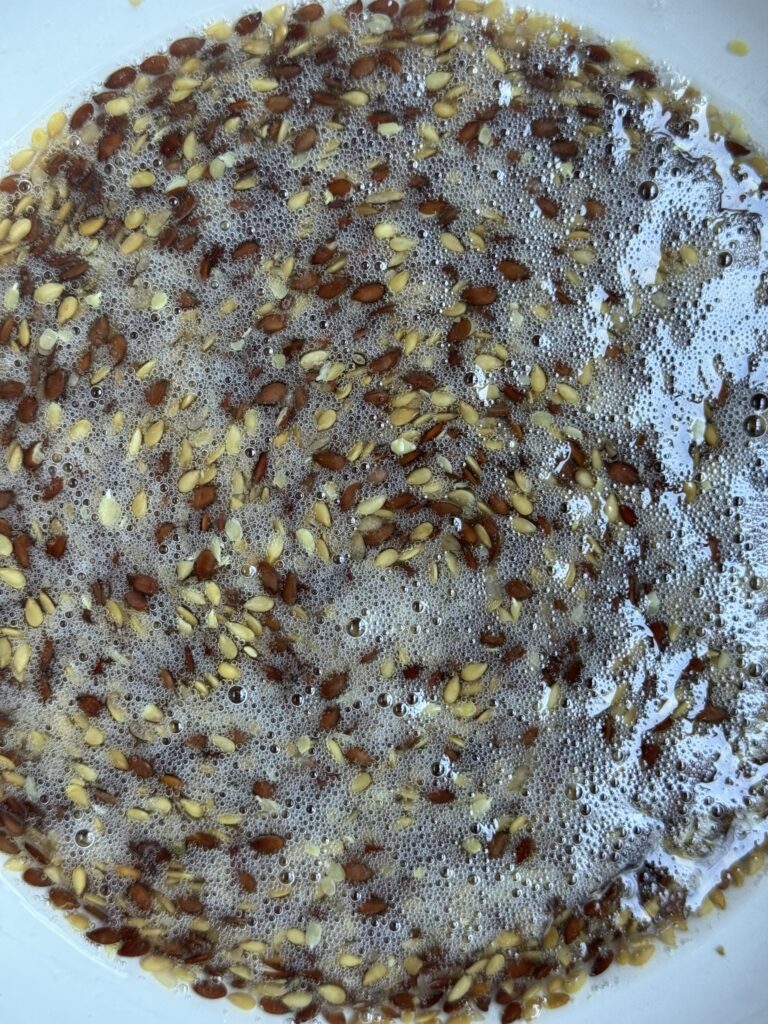 I’ve found it’s generally recommended to soak seeds before adding them to dough, I suppose so that they don’t steal water. I soaked a mix of regular and golden flax seeds (25g each) in 200g of water overnight while the levain fermented. I noticed something interesting in the morning: the seed/water mixture had little bubbles in it – it too was transforming (sprouting, I guess)! I stirred it around and many more bubbles appeared.