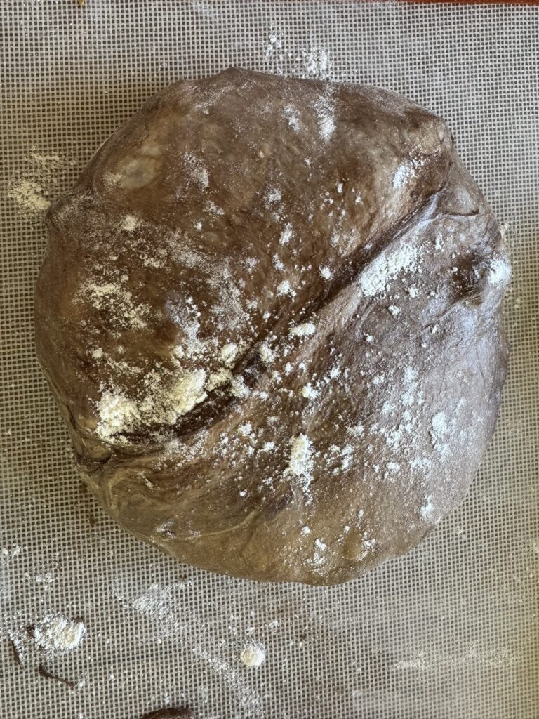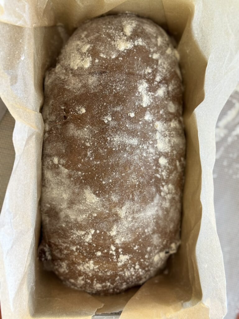 When the dough was finished fermenting, I divided it, bench rested it, and then shaped one half into a tension roll for baking in a loaf pan and the other one into a boule.